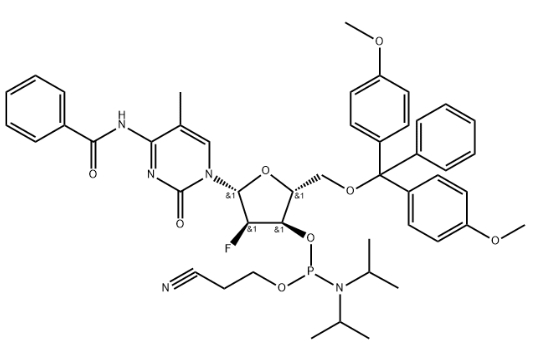 (2R,3R,4R,5R)-5-(4-benzamido-5-methyl-2-oxopyrimidin-1(2H)-yl)-2-((bis(4-methoxyphenyl)(phenyl)methoxy)methyl)-4-fluorotetrahydrofuran-3-yl (2-cyanoethyl) diisopropylphosphoramidite CAS#: 82495-83-6; ChemWhat Code: 1493951