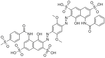 3-[[4-[[8-(benzoylamino)-1-hydroxy-3,6-disulpho-2-naphthyl]azo]-2,5-dimethoxyphenyl]azo]-4-hydroxy-5-[[4-(methylsulphonyl)benzoyl]amino]naphthalene-2,7-disulphonic acid CAS#: 31675-93-1 |