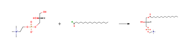 | Stage #1: L-glycero-3-phosphorylcholine With di(n-butyl)tin oxide In isopropyl alcohol for 1h; Reflux; Stage #2: n-hexadecanoyl chloride With triethylamine at 20℃; for 1h; | 90% |