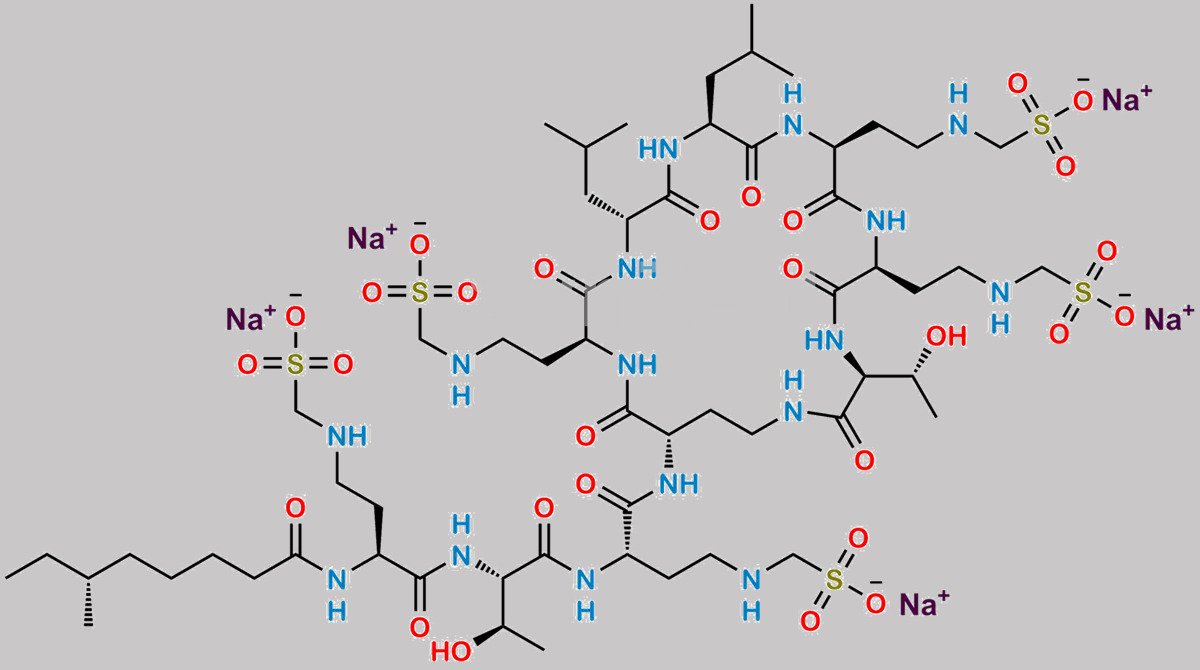 | Synonyms | Sodium (5S,8S,11S)-8-((R)-1-hydroxyethyl)-5-(((3S,6S,9S,12S,15R,18S,21S)-3-((R)-1-hydroxyethyl)-12,15-diisobutyl-2,5,8,11,14,17,20-heptaoxo-6,9,18-tris(2-((sulfonatomethyl)amino)ethyl)-1,4,7,10,13,16,19-heptaazacyclotricosan-21-yl)carbamoyl)-11-((R)-6-methyloctanamido)-7,10-dioxo-2,6,9,14-tetraazapentadecane-1,15-disulfonate |