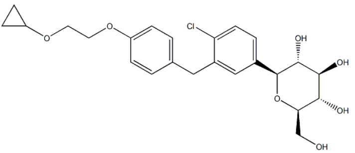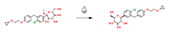 Experimental Procedure 5 Example 5 Preparation of ((2S,3R,4R,5S,6R)-2-(4-Chloro-3-(4-(2-Cyclopropoxyethoxy)Benzyl)Phenyl)-6-(Hydroxymethyl)Tetrahydro-2H-Pyran-3,4,5-triol Example 5 Preparation of ((2S,3R,4R,5S,6R)-2-(4-Chloro-3-(4-(2-Cyclopropoxyethoxy)Benzyl)Phenyl)-6-(Hydroxymethyl)Tetrahydro-2H-Pyran-3,4,5-triol [0236] This example describes preparation of (2S,3R,4R,5S,6R)-2-(4-chloro-3-(4-(2-cyclopropoxyethoxy)benzyl)phenyl)-6-(hydroxymethyl)tetrahydro-2H-pyran-3,4,5-triol by reduction of the anomeric OMe and/or OH. (3R,4S,5S,6R)-2-(4-Chloro-3-(4-(2-Cyclopropoxyethoxy)Benzyl)Phenyl)-6-(Hydroxymethyl)-2-Methoxytetrahydro-2H-Pyran-3,4,5-Triol Solution [0237] A 30 L glass reactor equipped with a thermometer was charged with crude (3R,4S,5S,6R)-2-(4-chloro-3-(4-(2-cyclopropoxyethoxy)benzyl)phenyl)-6-(hydroxymethyl)-2-methoxytetrahydro-2H-pyran-3,4,5-triol (2.7 kg), DCM (5.4 kg) and acetonitrile (3.2 kg), and the mixture was magnetically stirred until all the solids dissolved under nitrogen sparging. [0238] Triethylsilane Solution: [0239] BF3.Et2O (2.34 kg) was added to a cold (-21 to -15° C.) solution of triethysilane (2.55 kg) dichloromethane (5.4 kg) and acetonitrile (3.2 kg) under nitrogen. [0240] The (3R,4S,5S,6R)-2-(4-chloro-3-(4-(2-cyclopropoxyethoxy)benzyl)phenyl)-6-(hydroxymethyl)-2-methoxytetrahydro-2H-pyran-3,4,5-triol solution was added to the cold triethylsilane solution at such a rate to maintain the temperature between -20 and -25° C. (3 h). [0241] The reaction mixture was stirred for another 4 h at -22 to -25° C. and then quenched by addition of an aqueous solution of sodium bicarbonate (7.4% w/w, 18.3 kg) while keeping the internal temperature below -10° C. Solid sodium bicarbonate (1.35 kg) was added to adjust the pH to 7.5. The solvents were removed under reduced pressure (temperature below 40° C.). The residue was partitioned between ethyl acetate (18 kg) and water (9.2 kg). The layers were separated and the aqueous layer was extracted with ethyl acetate (2×9 kg). The combined organic layers were washed with brine (2×9 kg) and the solvents were removed under reduced pressure at the temperature below 40° C. until the condensation almost stop Anhydrous ethanol (9 kg) was added and concentrated to give the crude product of the title compound (2.5 kg, 90% yield, 90.8% HPLC purity, HPLC-0001) as foamy solid. | 90% |