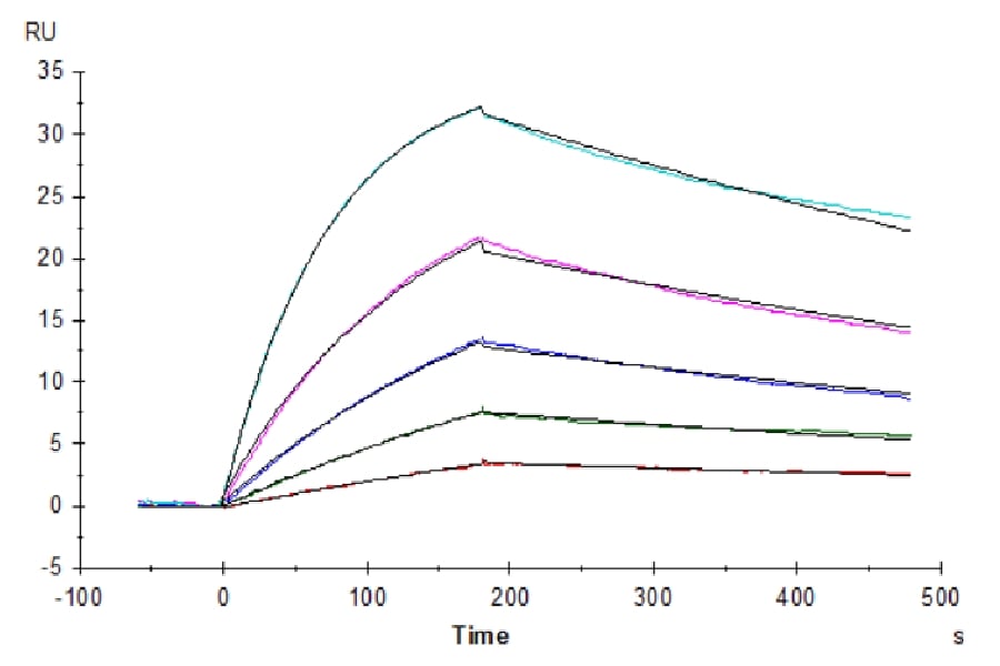| Activity | Immobilized Human M-CSF, His Tag at 0.5ug/ml (100ul/well) on the plate. Dose response curve for Human M-CSF R, hFc Tag with the EC50 of 14.2ng/ml determined by ELISA. The affinity constant of 0.24 nM as determined in SPR assay (Biacore T200). See testing image for detail. |